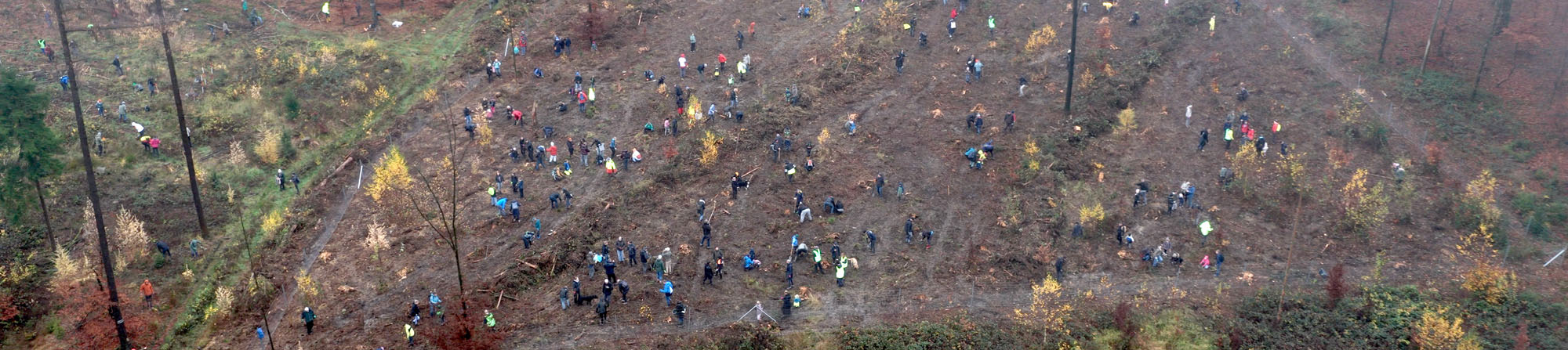 Die Mitarbeiterinnen und Mitarbeiter sowie deren Familien setzen junge Setzlinge im Teutoburger Wald.